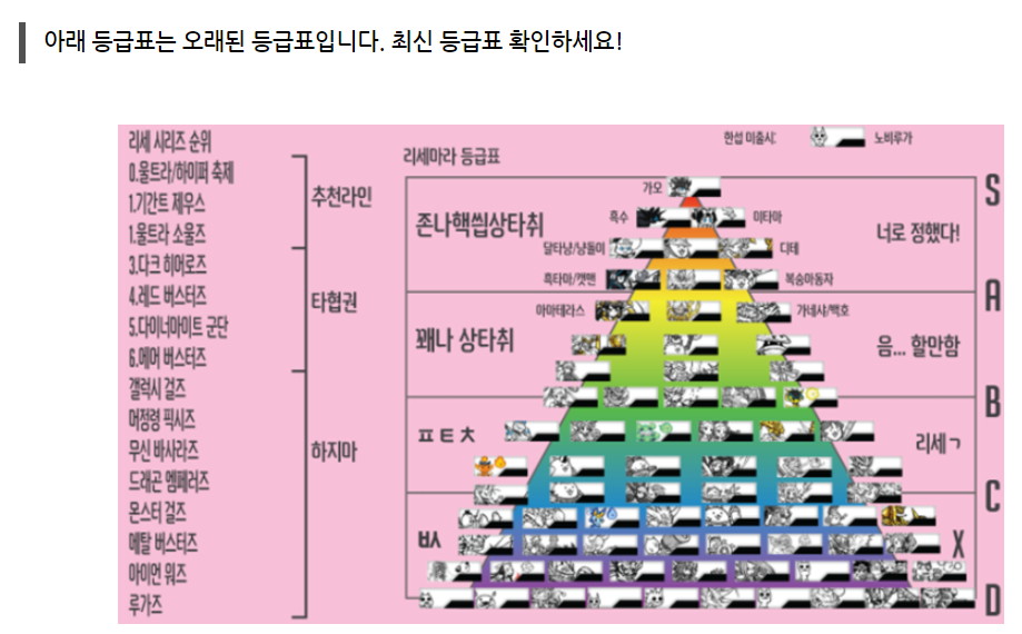 예전 등급표입니다. 캐릭터가 많이 추가되고 변경이 되었기 때문에 약간만 참고하시는 것을 추천드리겠습니다. 바로 아래 최신 등급표 남겨놨으니 리세마라 하실 때 참고하시면 좋을 것 같습니다.