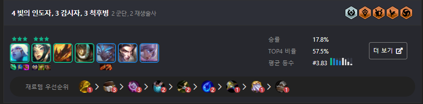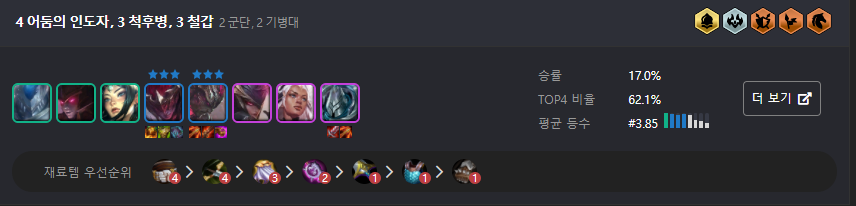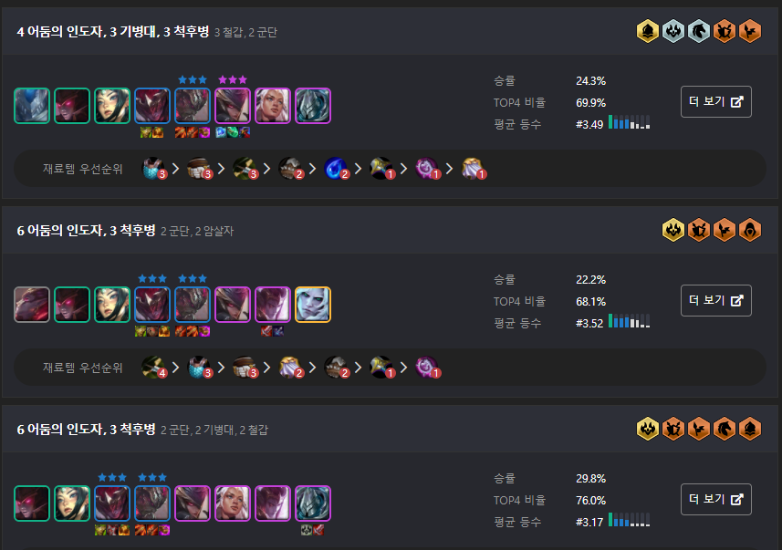 다음으로 추천드리는덱은 어둠의인도자 + 척후병 + 철갑 or 기병대 조합입니다. 꼭 6어둠의 인도자를 가지 않아도 철갑이나 기병대를 추가해 높은 승률을 바라볼 수 있고 5티어가 없기 때문에 단계 압박이 심하지 않습니다. 특히 캐리를 담당하고 있는 야스오와 리신이 3단계에 나오기 때문에 빠르게 캐리에게 아이템을 주면서 초중반에 강하게 몰아 칠 수 있는 것이 특징입니다.