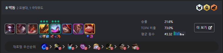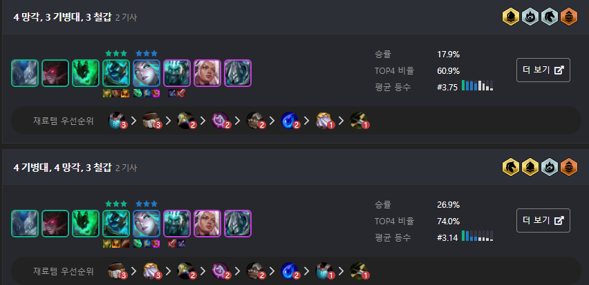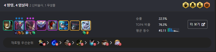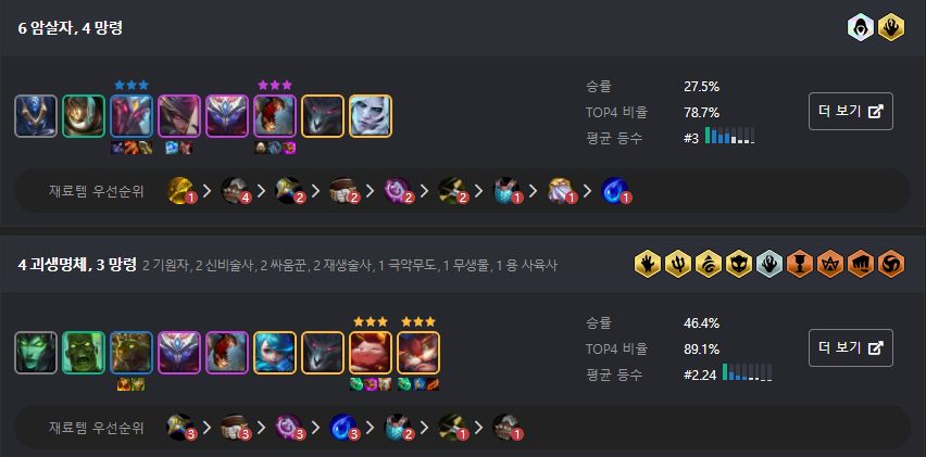 가장 강력하게 추천드리는 덱으로는 망령 3명을 기본으로 하는 암살자 or 괴생명체 덱입니다. 특히 망령 + 암살자 덱은 6암살을 가지 않아도 승률이 좋으며, 괴생명체 조합 역시 5단계 캐릭터가 많은 것이 부담스럽기는 하지만 최대한 버티면서 간다면 승률과 TOP4 비율이 엄청난 덱 중 하나입니다.