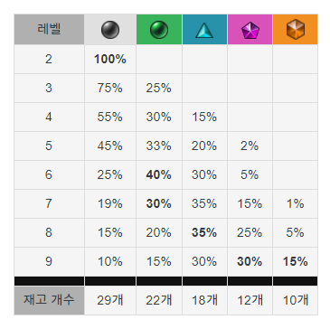레벨별 등장 확률입니다. 이번 메타에서는 3,4,5단계 영웅들이 캐리를 맡는 경우가 많기 때문에 최대한 빨리 6~7단계 이상까지 안정적으로 올리는것이 중요할 것으로 보입니다.