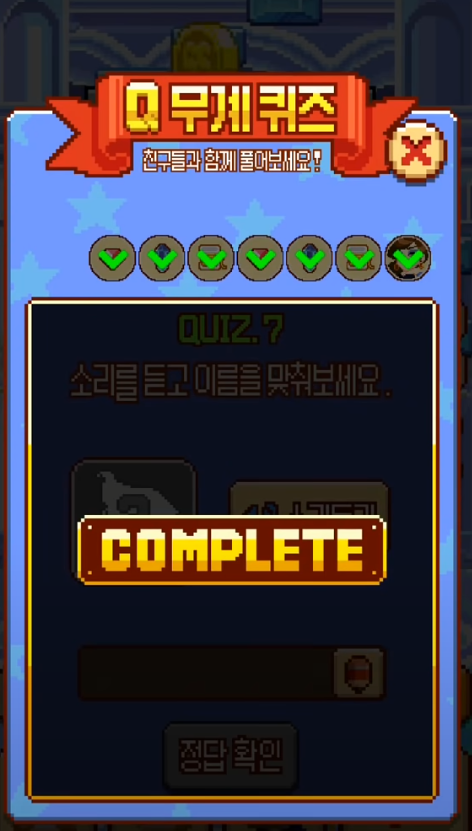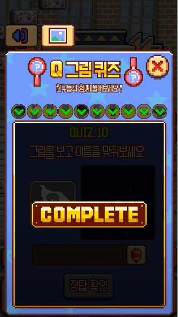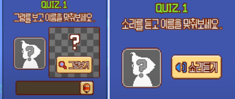 퀴즈에 참여하는 방법은 간단한데요. 메인화면에서 왼쪽 중앙에 Q버튼을 누르시면 소리퀴즈와 그림퀴즈를 보실 수가 있습니다. 생각보다 재미있으니 한번 풀어보는 것을 추천드립니다. 각각 그림퀴즈는 10개, 소리퀴즈는 7개로 준비가 되어있는데 소리는 찾아보면서 하면 쉬운 편이니 한번 풀어보는 것을 추천드립니다.