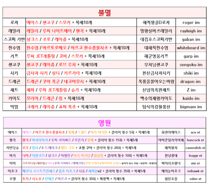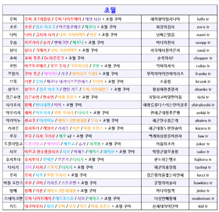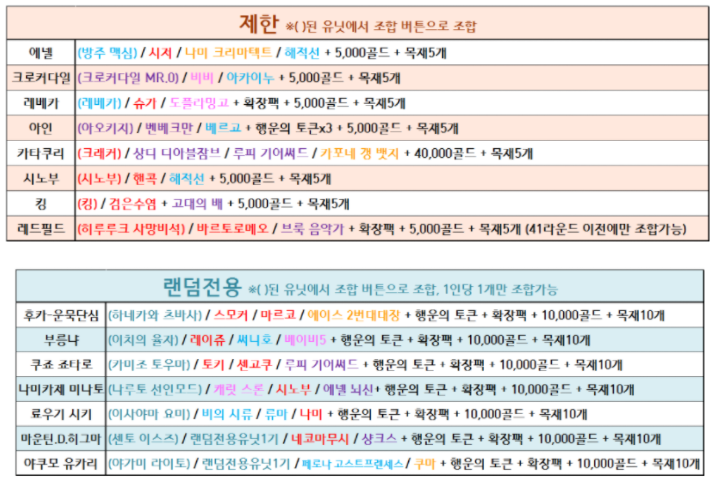 그 외에도 제한이나 랜덤전용 조합법이 존재를 합니다. 랜덤 전용 같은 경우에는 원피스에 안 나오는 캐릭터나 마운틴 D 히그마처럼 깨알 같은 개그 요소도 있습니다.