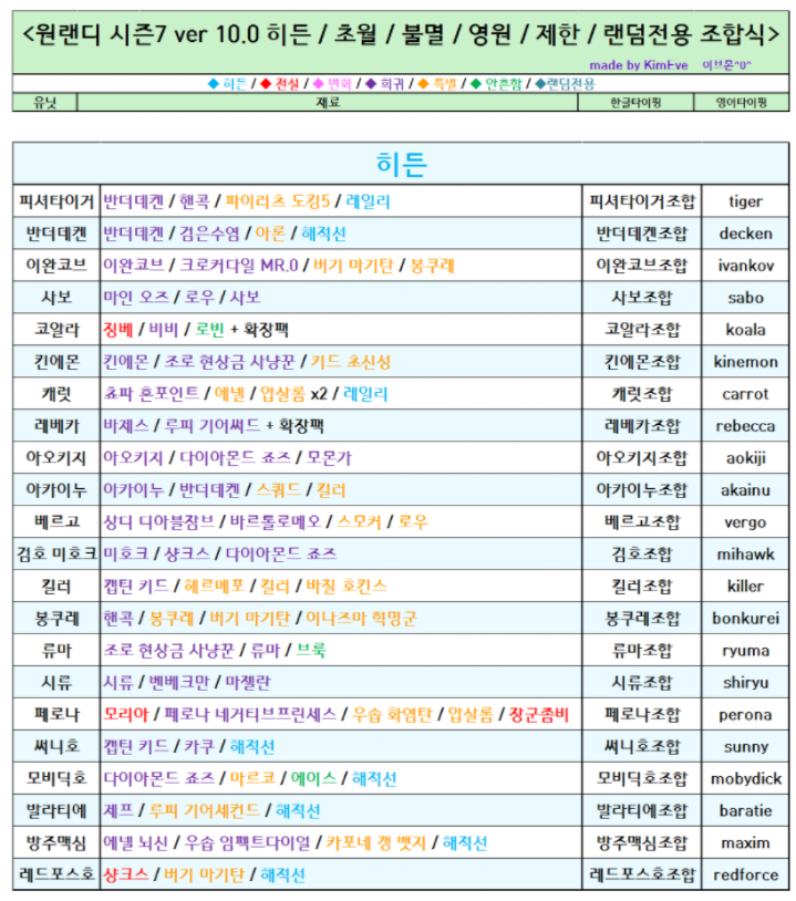 원피스 랜덤 디펜스는 정말 오랫동안 사랑받는 유즈맵 중 하나인데요. 여전히 많은 분들이 즐기시고 그러다 보니 게임을 하기 위해서 조합식을 많이 찾으시는 게임입니다. 원랜디에는 히든조합이라고 해서 특정 캐릭터를 모은 후에 특정 타이핑을 해야 조합이 되는 조합이 있는데 이걸 히든 조합이라고 합니다. 위에 나와있는 표대로 캐릭터를 모으신 후에 타이핑을 해주시면 히든 캐릭터를 얻으실 수가 있습니다. 표의 내용은 공식카페 KimEve님이 작성하신 내용으로 카페에는 다양한 조합식이 공개되어있으니 한번 찾아보시는 것도 좋을 것 같네요.