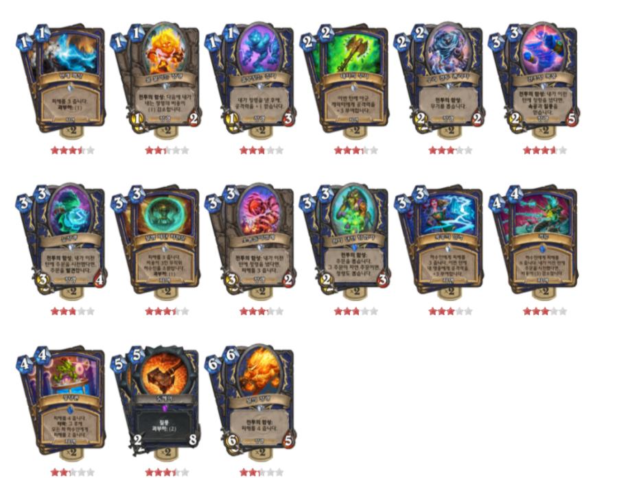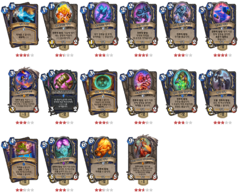 1티어 1위인 정령술사 덱보다는 좀 더 저렴하고 좀 더 강력한 세팅을 한 어그로정령술사덱입니다. 사실 둘 다 어그로에 가깝지만 이 덱이 좀 더 빠른 피니시를 낼 수가있는덱입니다. 다만 후반 안정성이 조금 더 떨어질 수 있기 때문에 어떤 덱을 하실지는 플레이어 성향에 따라 다르게 선택하시면 될 것 같네요. 가루가 1240 들어가는 매우 저렴한 덱이기 때문에 가루에 압박이 있는 초보 유저분들에게 추천드립니다.