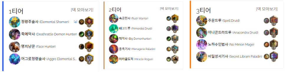 주로 쓰이는 1~3티어 덱들입니다. 1티어 덱이 전부 초반에 강력한 어그로 덱들로 구성이 되어있습니다. 어그로 메타라고 해도 될정도이며 특히 주술사가 엄청난 강세를 보이고 있습니다. 실제로도 너무 많이 만나서 고통을 호소하는 유저들이 있다고 하네요.