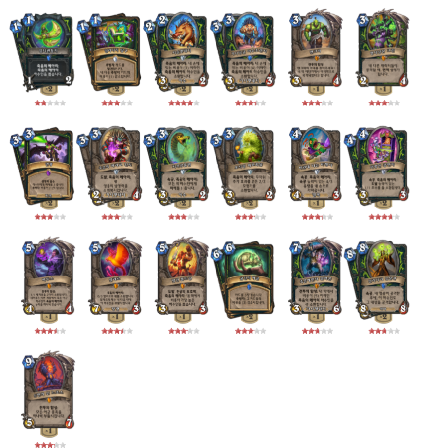 1티어 덱중에서 가장 비싼덱으로 10720의 가루가 들어가고 전설이 엄청나게 많이 들어가는 덱입니다. 초반부터 중후반까지 거를 타선이 없는덱으로 필드 장악력이 강한 죽음의 메아리를 가진 카드가 많은 죽메악사 덱입니다. 어느 정도 운영을 하고 싶다면 이 덱을 추천드리며 도발, 속공 카드가 많아 어그로 덱에도 강한 편이니 어그로에 지치셨다면 이덱을 추천드립니다.
