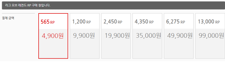 당연히 아시겠지만 RP충전의 경우 금액이 높아질수록 약간의 이득을 보는데 올라갈수록 대략 50RP의 이득을 보며 4900원의 경우 1RP 당 약8.67원 정도이지만 99,000원의 경우 7.6원 정도로 최대 가격일 때 1RP당 1원 정도 저렴하게 구매할 수 있습니다.