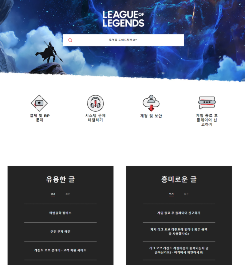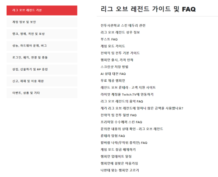 고객지원을 누르면 하단에 흥미로운 글이 있는데 여기서 '제가 리그 오브 레전드에 얼마나 많은 금액을 사용했나요?'라는 내용을 누르면 확인할 수 가있습니다. 만약 안 나오게 되면 리그 오브 레전드 가이드 및 FAQ를 누르시면 되는데요.