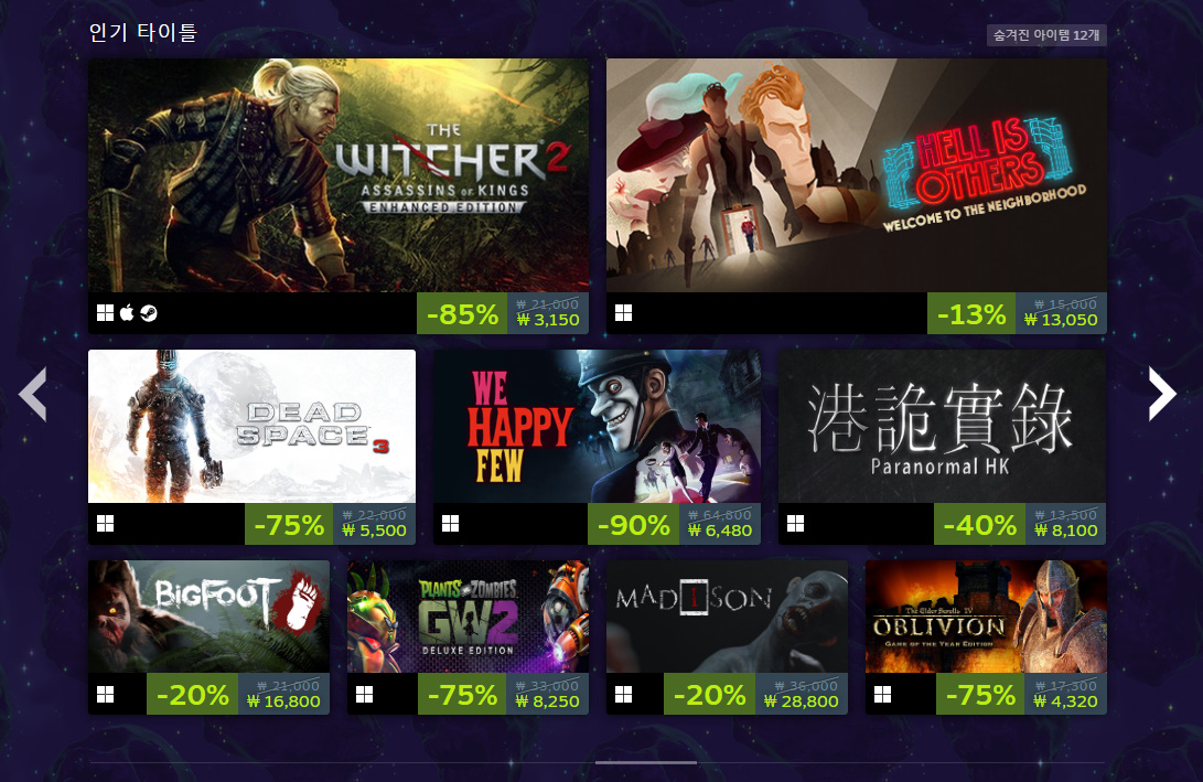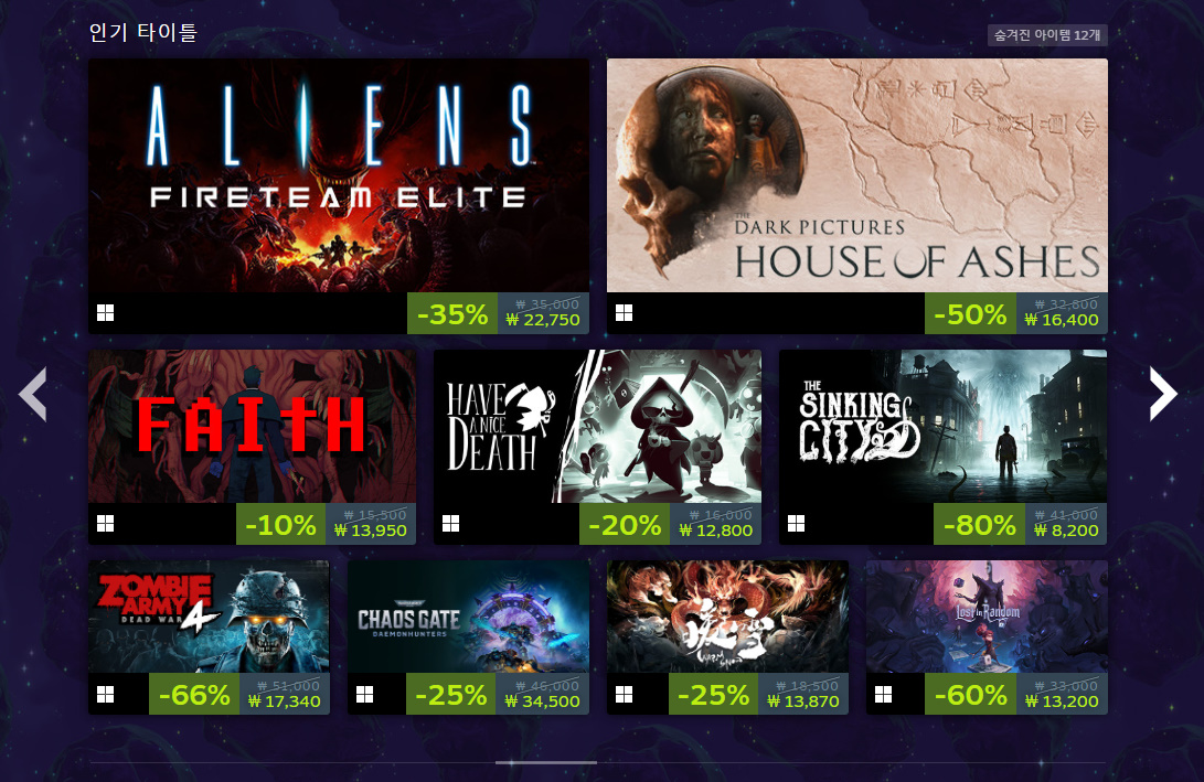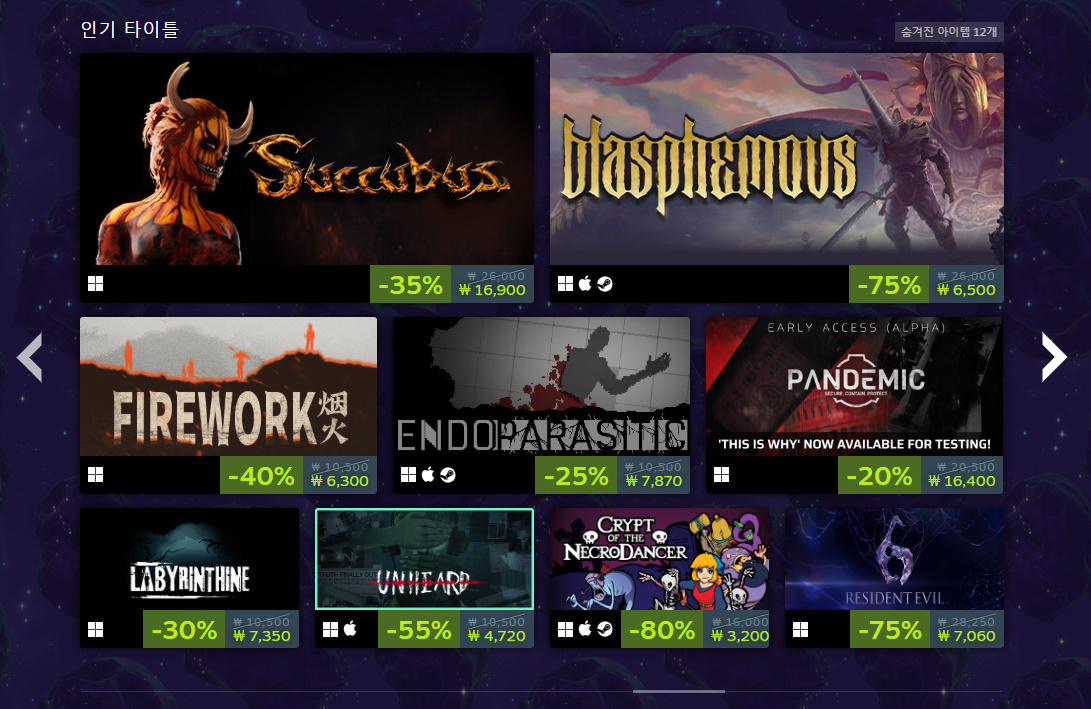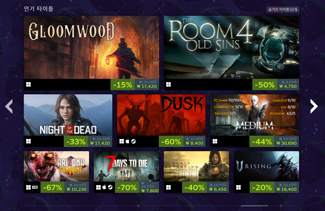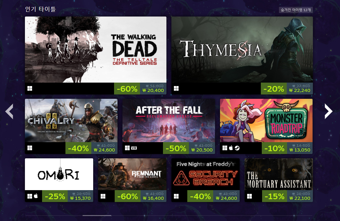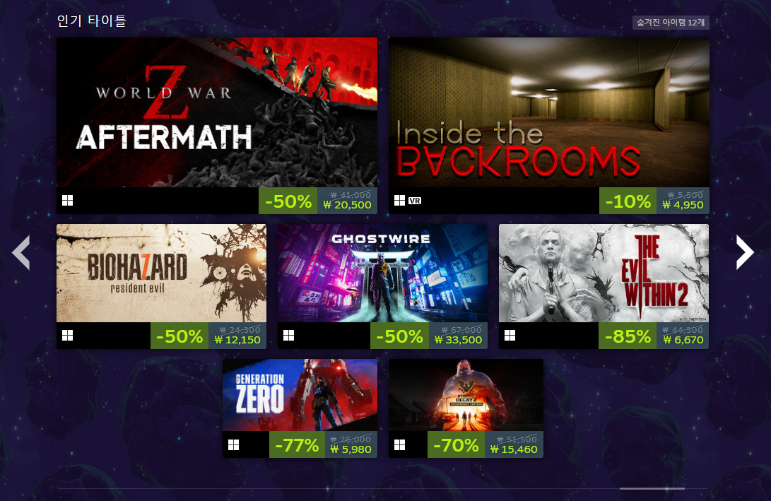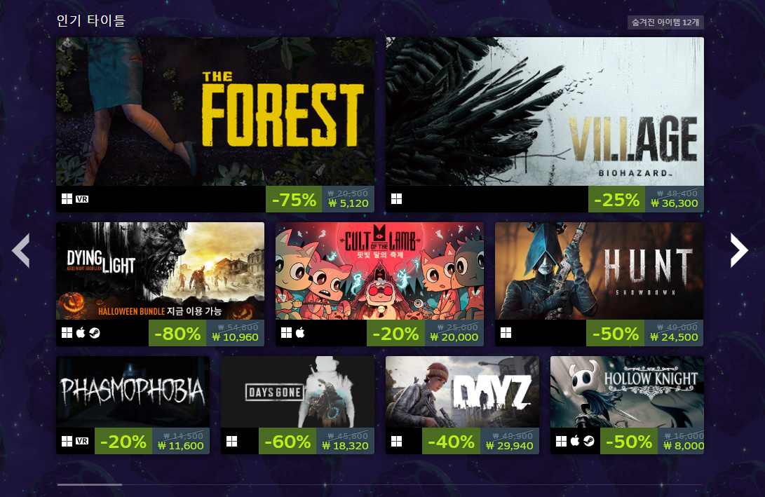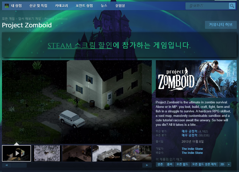 인디게임인 프로젝트 좀보이드는 최근 스트리머들 사이에서 인기를 누리고 있는 게임인데요. 꾸준한 업데이트를 통해 2013년 출시 후에도 콘텐츠가 많이 늘어나고 게임성도 좋아져서 낮은 할인율에도 잘 팔리는 게임입니다. 할로윈 같을 때가 아니면 할인을 안 하기 때문에 이번 할인 이벤트 때 구매해 보셨으면 좋겠습니다. 할인율은 33%입니다.