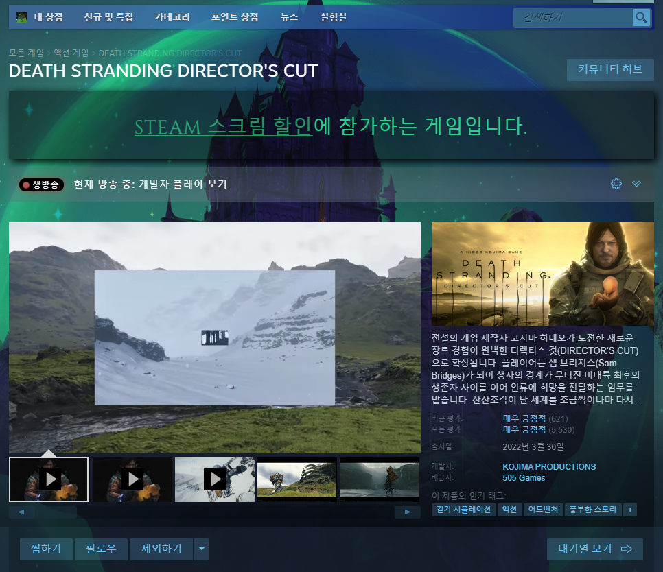 데스스트랜딩 디렉터스 컷입니다. 오픈월드 시네마틱 어드벤처 게임인데요. 스토리를 즐기며 배달을 하는 독특한 게임성을 가지고 있습니다. 호불호를 타는 게임으로 어떤 유저는 극찬을 하지만 어떤 유저는 별로라고 하는 만큼 해보실 거라면 좀 더 찾아보시고 구매하는 것을 추천드립니다. 스팀 평가 매우 긍정적으로 평가가 좋은 게임이니 이번 기회에 40% 할인율로 만나보시면 어떨까 싶네요.