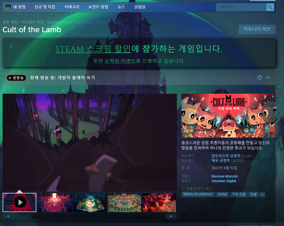 다음은 얼마 전에 출시한 컬트오브더램입니다. 기다리는 자의 선택을 받은 어린양이 되어 적대 세력인 옛 산양 무리를 상대로 포로를 구출하고 교단을 성장시켜나가는 게임으로 공포게임보다는 그냥 호러 요소가 있는 로그라이크 던전RPG 건설 시뮬레이션 게임입니다. 할인율이 20%로 큰 편은 아니지만 출시된 지 얼마 안 됐기 때문에 이번에 할인하는 만큼 놓치지 않으셨으면 좋겠네요.