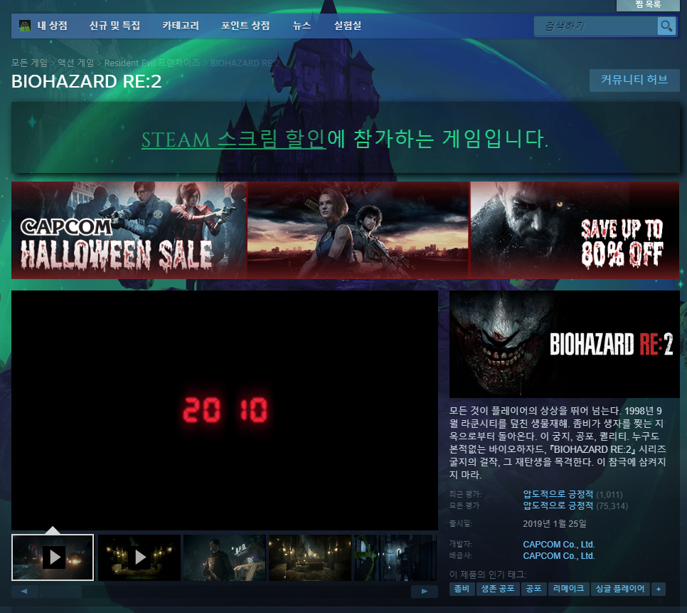 첫 번째 게임은 제가 너무 재미있게 즐겼던 바이오하자드 RE2 입니다. 제가 플레이해본 리메이크 작품 중에서 다섯 손가락에 꼽을 만큼 리메이크가 잘 돼있으며 좀비 게임의 정석 같은 게임인데요. 느리면서도 강력한 좀비와 총알 부족의 압박을 느껴보고 싶다면 바이오하자드 RE를 가장 추천드립니다. 할인율은 70% 상당히 높습니다.