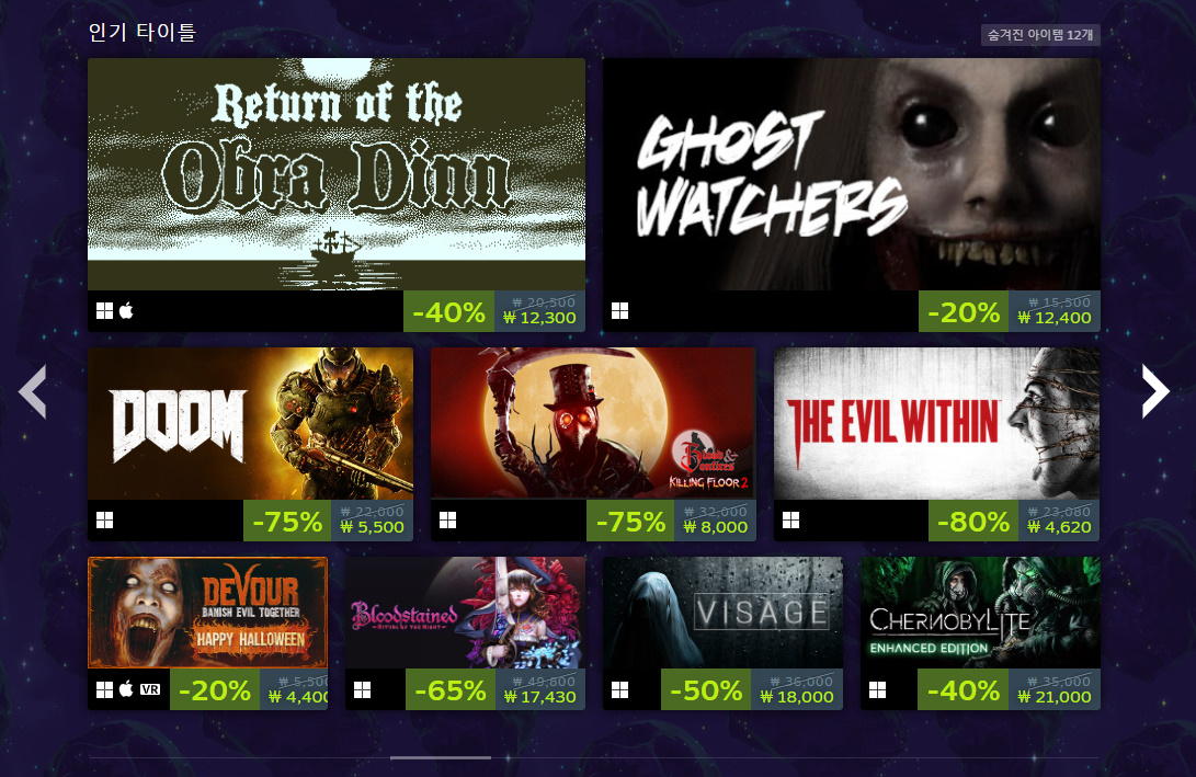오늘은 할로윈 특집 스팀할인 세일 게임추천 TOP5를 소개해드리도록 하겠습니다. 10월 25일부터 11월 1일까지 스팀 스크림 할로윈 축제 할인 세일이 진행이 되는데요. 공포게임이나 호러 장르의 게임을 좋아하시는 분들에게는 놓쳐서는 안 되는 기회가 왔습니다. 공포게임 명작도 상당히 많고 호러 요소가 있는 명작 게임도 많으니 어떤 게임이 있는지 살펴보러 가시죠.