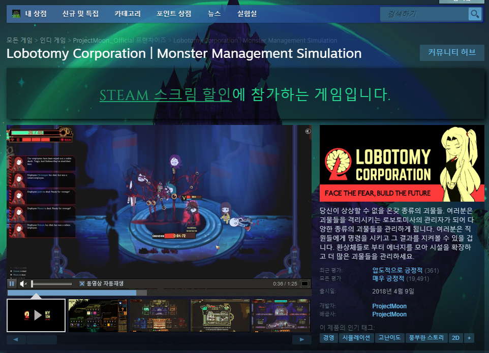 마지막으로 로보토미 코퍼레이션 입니다. 엄청난 난이도와 특유의 게임성 때문에 호불호를 많이 타며 어려운 게임을 좋아하지 않는 분들에게는 추천드리지 않는데요. 하지만 몬스터 매니지먼트라는 상당히 독특한 게임성과 도전 욕구를 불러 일으 키는 난이도로 어려운 게임을 좋아하시는 분들이라면 한번 해볼 만한 게임입니다. 후속작 라이브러리 오브 루이나 또한 독특한 게임성으로 마니아들에게 인기가 많은 만큼 한번 해보시면 어떨까 싶네요. 할로윈 특집 스팀할인 세일 게임추천 TOP5 소식은 여기까지입니다. 정보 도움이 되었으면 좋겠네요.