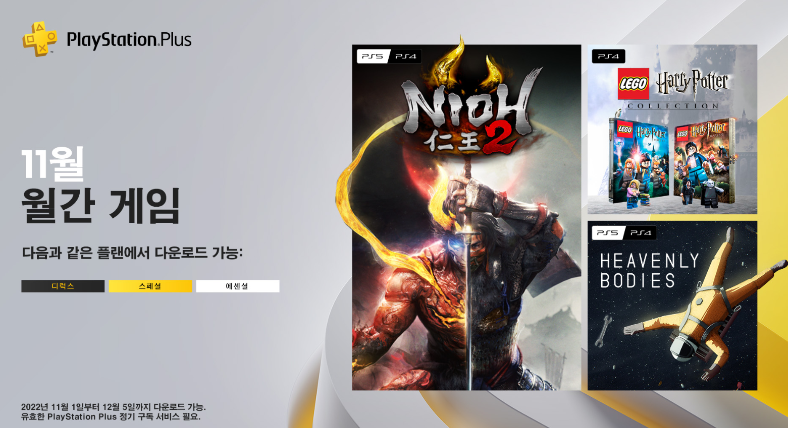 오늘은 PSN 11월 무료게임 소식을 전해드리도록 하겠습니다. 이번 PSN 11월 무료게임이 공개되었습니다. 총 3개로 니오 인왕2, 레고 해리포터 컬렉션, 헤븐리 바디스 우주정거장 미션 총 3개입니다. 11월 1일부터 12월 5일까지 배포가 된다고하며, 게임을 받아두면 PSN유지되는 동안 게임을 다운로드해 즐길 수 있습니다.