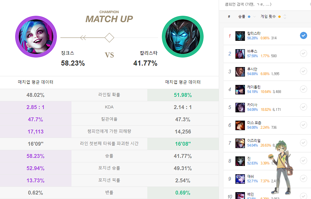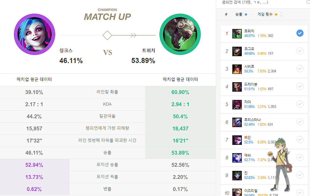 원딜들은 기본적으로 징크스보다 중후반 캐리력이 떨어지는 챔피언들 상대로 승률이 좋습니다. 또 서포터들의 경우 수비적이거나 수동 적인 챔피언들 상대로 좋으며, 들어오는 챔피언보다는 정식한타나 대치구도 상황의 챔피언들 상대로 좋은 모습을 보여줍니다.