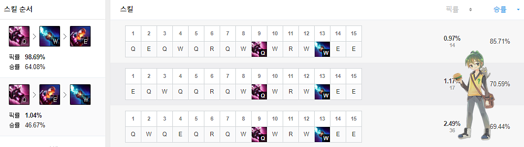 스킬은 QWE선마를 합니다. Q는 사거리와 공격속도에 영향을 주기 때문에 가장 먼저 마스터를 하며, 이후 W를 찍는데 W는 화력도 높고, 슬로우 시간 증가와 쿨타임 감소가 눈에 띌정도로 증가폭이 높기 때문에 W선마가 효율이 좋습니다. E의 경우 쿨타임이 많이 줄어들지만 한타에서 2번이상 쓰기 어렵기 때문에 보통 W선마를 합니다.