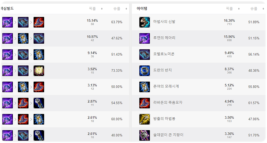 얼마전 Q스킬의 대미지 버프, W의 밀쳐내기 거리 버프, E스킬의 둔화율 버프가 있었습니다. 버프를 받은 상태에서 승률 50%인지라 아주 안좋은것은 아니지만 결코 좋다고 하기에도 애매한 상황입니다. 또 요즘 암살자들이 미드에 많이 등장하는 만큼 선픽으로도 좋은 픽이 아니고요. 그래도 나쁘지는 않은 픽이니 상황을 보고 선택하시는것도 좋은 판단이 될 수 있습니다. 감사합니다.