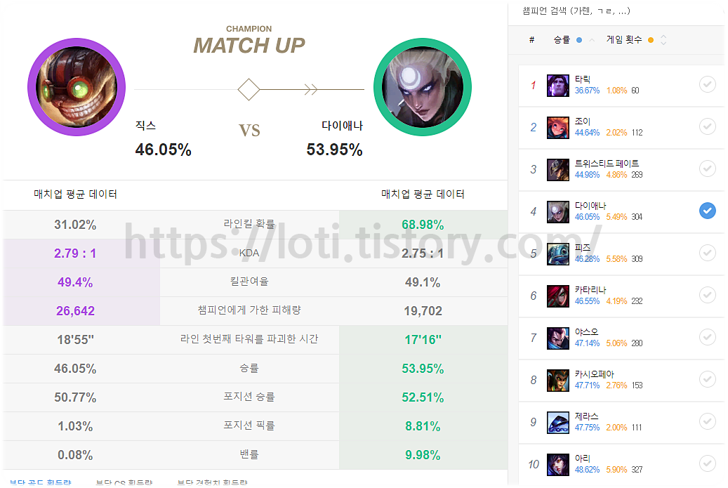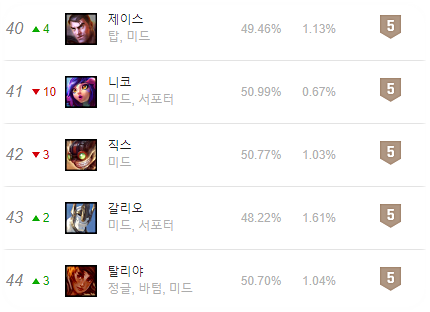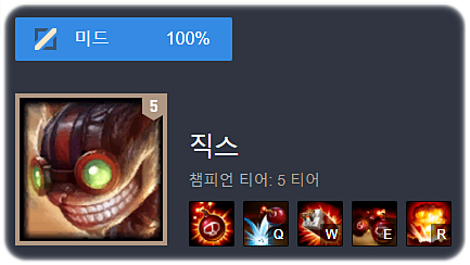 얼마전 버프를 통해 잠깐 3티어까지 올라갔지만 역시다 5티어까지 떨어진 직스입니다. 충분히 가능성은 보여줬고 승률도 준수하기는하지만 메타 특성상 메인 픽으로 올라가기는 어려울 것 같으며, 상대 픽을 보고 상대해야하는 후픽형 챔피언이기 때문에 선픽으로서의 가치도 떨어집니다. 그래도 상황만 맞는다면 충분히 활약가능성은 보이는 챔피언 입니다.