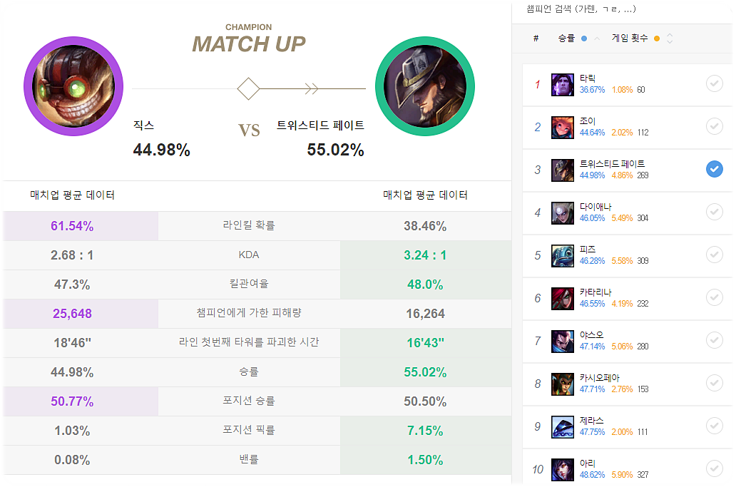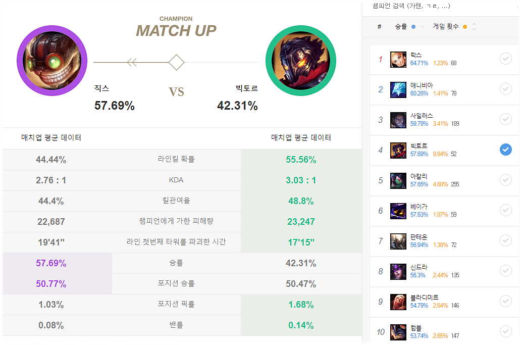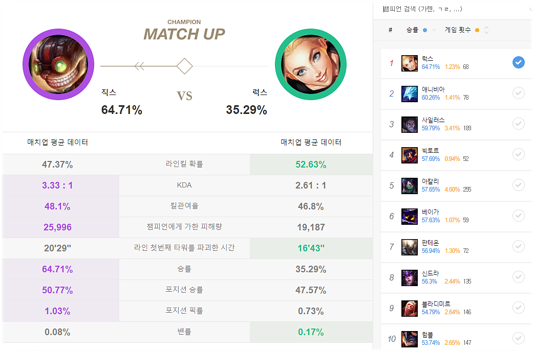 라인전에 특화된 챔피언을 상대로 매우 좋은 모습을 보여줍니다. 이유는 긴 사거리를 통해서 같이 성장이 가능하고 같이 성장을 하게될경우 공수성에 강한 직스는 게임을 질질 끌고가기에 좋아서 입니다. 특히 직스를 잡을 만한 방도가 없다면 라인클리어면에서 압도를 하기 때문에 상대도 붙잡혀있을수밖에 없습니다.