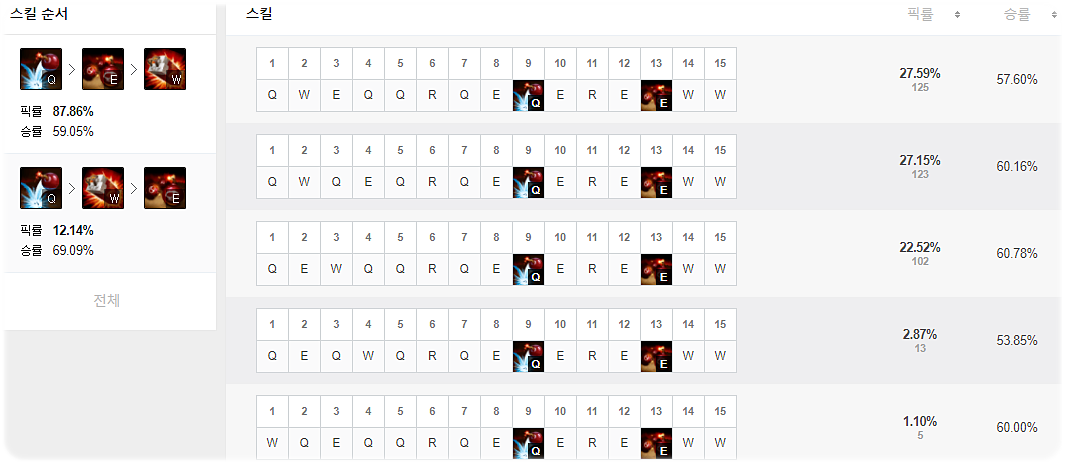 메인스킬은 Q스킬을 가장 먼저 마스터를 합니다. 이후 W와 E로 갈리는데 W는 쿨타임이 줄고, E스킬의 경우 화력 증가 폭이 높습니다. 이 화력 증가폭이 매우 높은 편이라 쿨타임이나 다른것이 안줄어듦에도 불구하고 찍을정도로 스킬당 화력 증가 효율이 좋은 챔피언 입니다. 화력을 원한다면 E를 생존력을 원한다면 W를 추천드립니다.