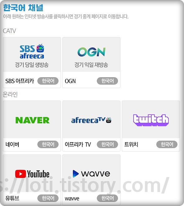 TV로는 SBS 아프리카와 OGN에서 시청하 실수 있습니다. OGN의 경우 다음날 재방송이기 때문에 생방은 SBS 아프리카나 온라인 방송으로 보시면 되겠습니다. 온라인은 네이버TV, 아프리카TV, 트위치, 유튜브, Wavve에서 시청할 수 있습니다. 저는 트위치나 유튜브로 시청하는 편이고 개인 방송이 있는 아프리카와 트위치는 중계방이 있으니 중계방에서 스트리머와 함께 보시는 것도 재미를 더하는 방법입니다. 대표적으로 엠비션, 울프 선수의 방송이 있습니다.