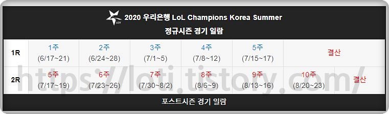 2020 우리은행 LCK Summer가 시작이 되었습니다. 참가팀은 T1, 젠지, DRX, 담원, KT, 아프리카, 설해원, 한화, 다이나믹스, 샌드박스 게이밍이 참가를 합니다. 이번 시즌부터는 프랜차이즈가 도입이 되어서 승강전인 롤 챌린저스 코리아가 사라졌습니다. 그래서 승강전이 없다는 점 참고하시고 보시면 될 것 같네요.