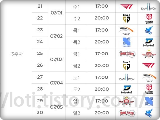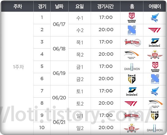 1라운드는 월/화를 쉬고 수 목 금 토 일 2매치씩 진행이 됩니다. 이미 한주가 진행이 되었는데 경기가 상당히 재미있어서 놀랐습니다. 제드, 말파이트 등 기존에 안 나오던 챔피언들이 등장을 하는 것이 상당히 놀라웠고 설해원과 다이나믹스가 생각보다 잘해서 놀랐습니다.