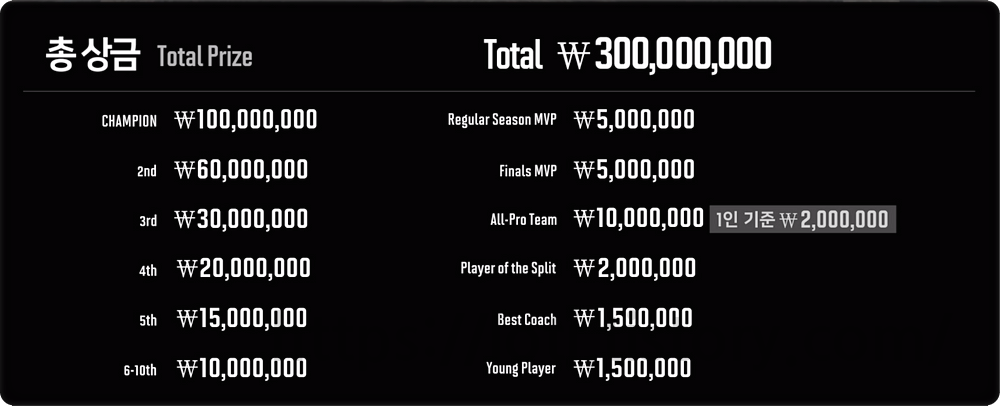 상금은 총 3억 원으로 1위 1억, 2위 6천, 3위 3천 이런식으로 내려가며 시즌MVP, 파이널 MVP 등 개인 상금이 따로 있습니다. 프렌차이즈 진행이 돼서 상금 규모가 더 커질 줄 알았는데 아직은 생각보다 적다는 생각이 드네요.