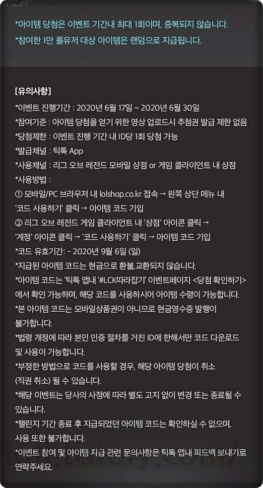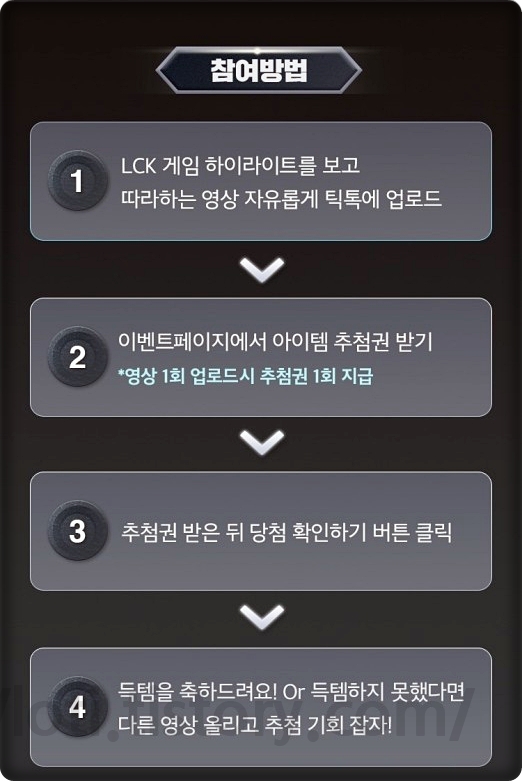 참여 방법은 LCK 하이라이트를 시청하고, 해당 영상과 비슷하게 따라 하기 영상을 만드시면 됩니다. 이후 틱톡에 영상을 업로드하고 아이템 추첨권을 받은 뒤에 당첨 여부를 확인하시면 됩니다. 당첨이 되지 않으면 다시 영상을 올리면 되고 당첨이 되면 다시 참여가 안되니 1번만 하시면 되겠습니다.