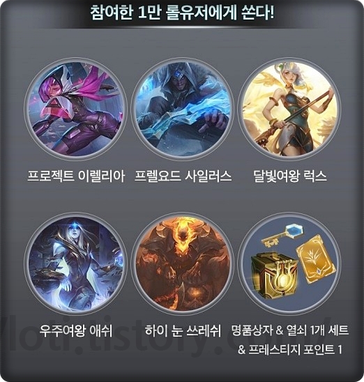 참여를 하면 당첨되신 분들 총 1만 명에게 서사급 스킨과 명품상자 & 열쇠 세트, 프레스티지 포인트 1개를 받을 수 있습니다. 바로바로 당첨되는 이벤트라 많이 참여만 하면 어지간하면 받을 수 있는 이벤트입니다. 듣기로는 서사급 스킨은 어떤 스킨을 받을 수 있는지 알 수 있다고 합니다. 이미 있는 스킨이라면 다른 분과 교환을 하시면 되겠습니다.