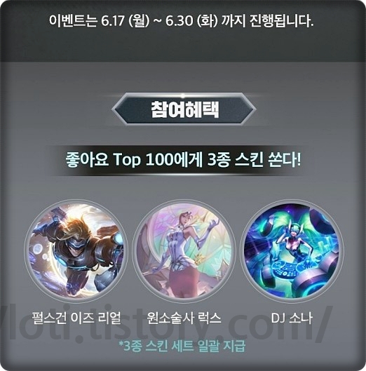 좋아요 탑 100분에게는 초월급 스킨 3종 펄스건 이즈리얼, 원소술사 럭스, DJ 소나를 받을 수 있습니다. 이벤트까 끝날 때까지 진행이 되는 이벤트이기 때문에 최대한 인기 있는 영상을 만드는 분이 타가지 않을까 생각을 합니다. 아마 롤을 오래 하신 분들이라면 가지고 있어서 아쉬울 것 같네요.