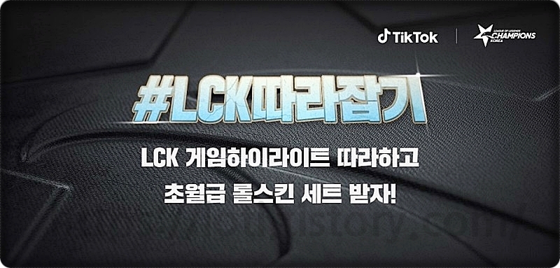 LCK 서머가 시작을 하고 6월 17일부터 6월 30일까지 LCK따라잡기 이벤트가 진행되고 있습니다. LCK 따라잡기 이벤트는 틱톡과 LCK가 주관으로 진행되는 이벤트인데, LCK를 보고 LCK의 명장면을 따라한 후에 영상을 틱톡에 올리면 되는 이벤트입니다. 서사급 스킨, 명품 상자 & 열쇠 세트, 프레스티지 포인트 1까지 받을 수 있는 혜자로운 이벤트입니다.