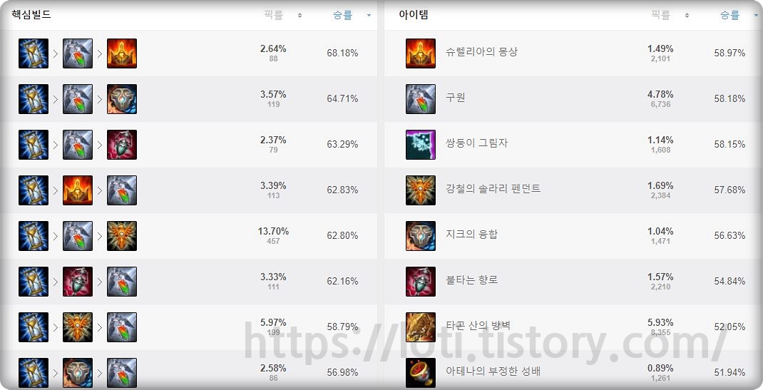 일반적인 서포터랑 다르게 진입하는 경우가 많기 때문에 존야를 첫코어로 가고, 이후 구원 or 슈렐리아, 향로, 솔라리 등을 많이 갑니다. 이니시가 충분히 있고 굳이 진입을 안 하면서 원딜 지원만 한다면 존야를 무리해서 뽑을 필요 없이 구원이나 서포터 아이템을 먼저 가셔도 상관없습니다.