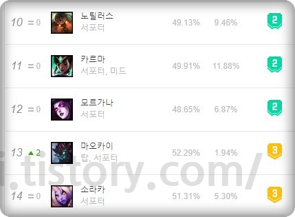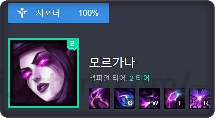 메타의 흐름이 점점 모르가나에게 웃어주지 않는 메타입니다. 원딜의 캐리력이 내려가고 게임의 길이가 길어지면서 원딜의 캐리력을 올려주는 서포터가 떠오르고 있는데 모르가나는 약간 상황을 많이 타는 서포터라 순수하게 원딜 케어에 집중하는 서포터들에게 전반적으로 밀리고 있습니다. 후픽 카드로 좋은 챔피언이고 적 챔피언을 보고 적당히 뽑아주시면 되겠습니다.