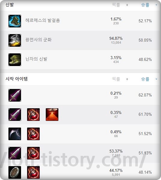 헤르메스의 픽률이 낮기는 하지만 상황에 따라서 가면 큰 힘을 발 휘할 수 있습니다. 무난하게는 광전사의 군화를 선택을 합니다. 시작 아이템은 도란검이 무난합니다.