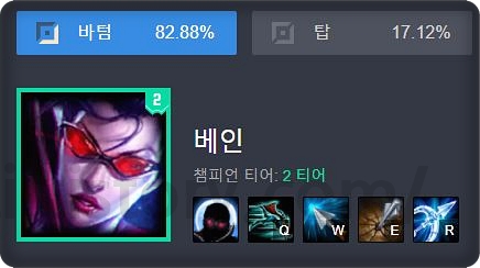 견제력이 강하고, 라인 클리어가 강한 챔피언 상대로 어려운 모습을 보여주며, 베인과 비슷한 사정거리를 가지고 있거나, 미니언을 넘어서 견제를 못하는 이즈리얼 같은 챔피언 상대로 강한 모습을 보여줍니다. 최근 1티어인 이즈리얼 상대로 좋다는 점이 베인의 큰 장점이겠네요.
