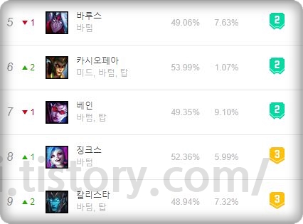 바텀, 탑라인으로 가는 몇 안 되는 원거리 딜러입니다. 탑 성적이 상당히 괜찮은데 뚜벅이 탑솔러 상대로 일방적으로 성장하기만 하면 후반 캐리력은 말할 것도 없는 챔피언입니다. 다만 탑 라인에서는 생존력이 떨어지기 때문에 라인 관리와 견제, 시야 장악 등 운영 난이도가 많이 올라가니 이점 참고하셔서 운영하 실수 있는 분들만 탑에 가셔야 합니다.
