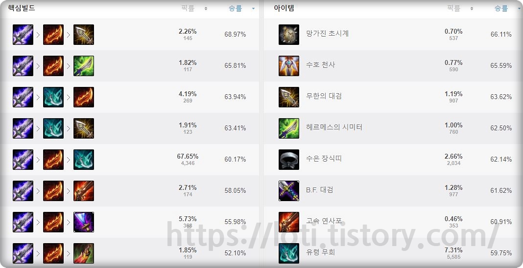 템트리는 몰락검, 구인수 고정에 이후에 무한의 대검 or 유령무희를 갑니다. 보통 몰락검, 구인수, 무한의대검, 유령무희, 수호천사 or 헤르메스의 시미터를 간다고 보시면 좋습니다. 최근 대세인 죽무와 잘 어울리지 않기 때문에 딜 위주의 무난한 세팅을 추천드립니다.