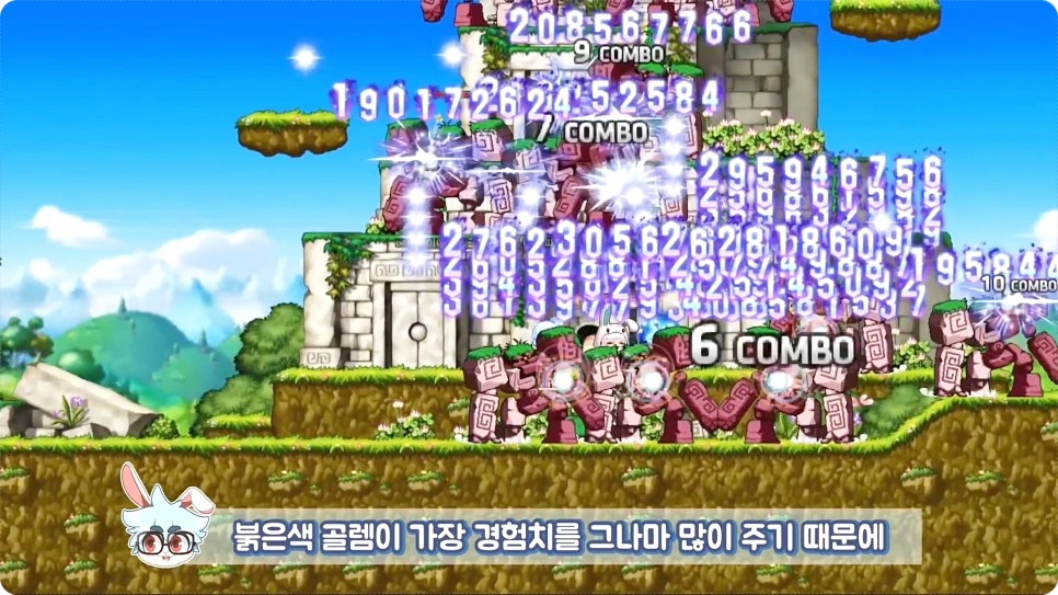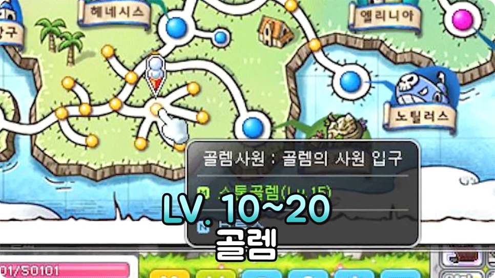 10~20까지는 빅토리아 아일랜드 헤네시스에서 오른쪽으로 가면 나오는 골렘사원에서 사냥을 진행하시면 됩니다. 이때 참고하실 점이 골렘사원에는 다양한 종류의 골렘이 나오는데 붉은색 골렘이 가장 많은 경험치를 주니 붉은 골렘을 잡는 것이 핵심 포인트라고 합니다.