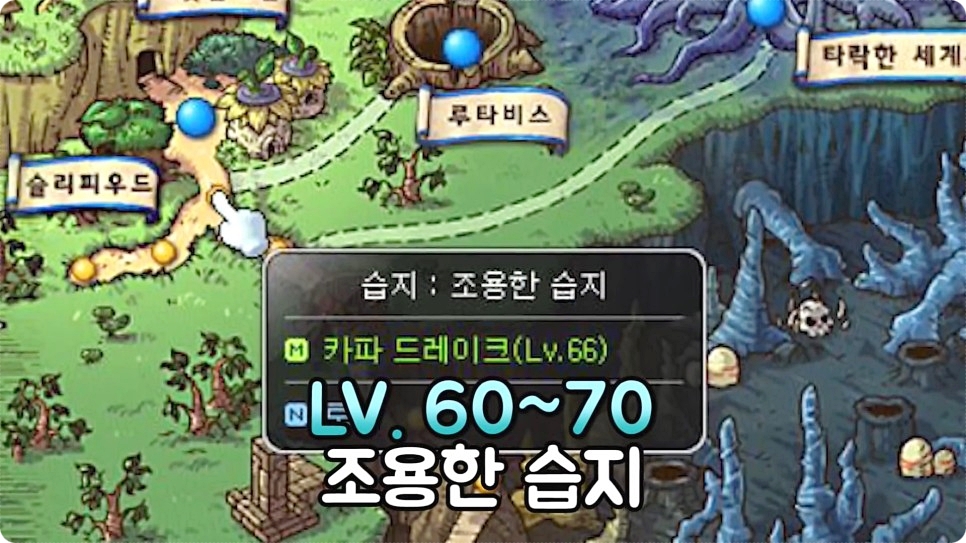 60~70 레벨은 슬리피우드의 조용한 습지를 도시면 됩니다. 습지에는 카파 드레이즈가 등장을 하는데 지형과 젠률이 괜찮아서 레벨업 장소로 편하면서도 좋은 장소라고 하네요. 다만 아는 사람들이 많은 인기 사냥터라 사람이 많을 경우 옆 사냥터나, 안쪽으로 들어가 레드 드레이크를 사냥하셔도 좋다고 합니다. 또 도장을 받아두면 나중에 월드간 이동이 간편해지니 도장받아두는 것도 잊지 마세요.