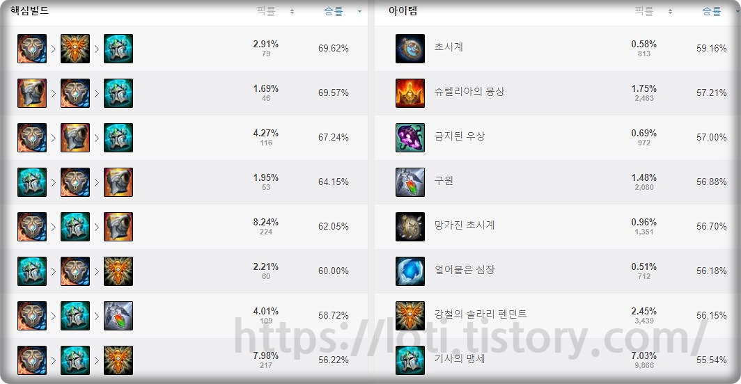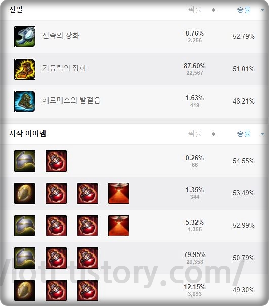 기동력 가격이 올라간 이후 기동력의 픽률이 높지만 신속의 장화의 픽률과 승률이 무시할 수 없는 통계를 보여주고 있습니다. 개인적으로 신속 추천드리고, 시작 아이템은 강철 어깨보호대 추천을 드립니다.