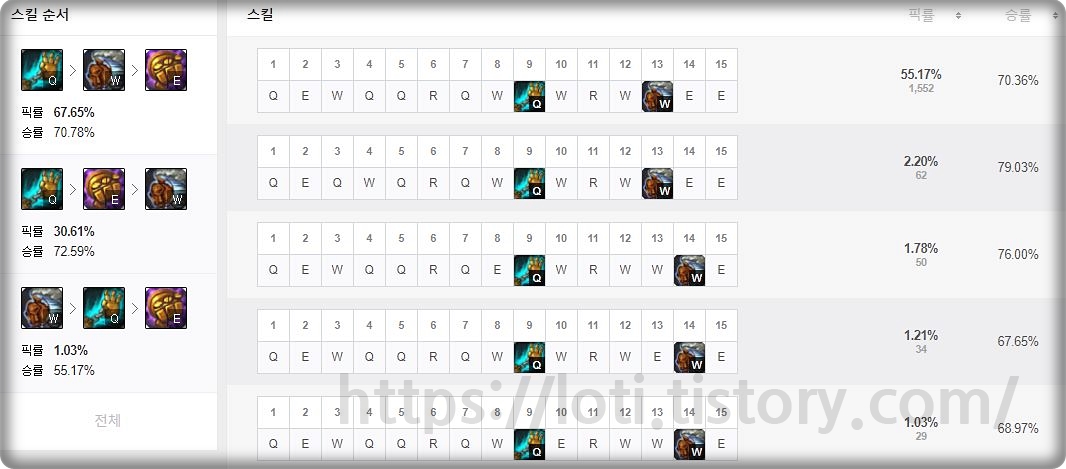 QWE선마와 QEW선마가 있는데 QWE는 스킬 효율 순서대로 찍은 것입니다. QEW의 경우 E스킬이 레벨 효율이 낮지만 원딜을 지키는 등 확정 에어본을 자주 써야 한다면 E선마가 좋을 때가 있습니다. 무난하게 QWE 추천드립니다.