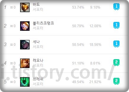 바드, 브리츠크랭크, 세나, 레오나, 쓰레쉬까지 정말 1티어에서 언제 내려올지 궁금할 정도로 꾸준히 상위권을 차지하고 있습니다. 물론 최근 룰루, 질리언, 카르마까지 유틸형 서포터가 이 5명의 자리를 위협하고 있기는 하지만 시즌 초부터 정말 꾸준히 픽되고 꾸준히 승률을 기록하고 있는 챔피언들 입니다. 그 중에서 바드, 블리츠크랭크는 정말 오랜시간 1티어에 머물고 있습니다.