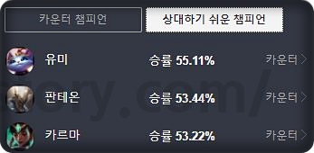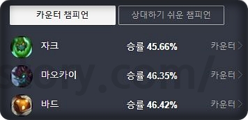 어려운 상성으로 그랩을 역이용하거나, 그랩을 흡수가 가능한 챔피언이 어렵습니다. 알리스타, 타릭, 레오나, 마오카이 등이 그런 경우이며, 시비르, 이즈리얼은 그랩 흡수가 가능해 블리츠에게 까다로운 원딜들입니다. 반대로 대부분의 서포터들은 끌리면 매우 고전하며, 특히 몸이 약한 챔피언일수록 힘들어하는 경향이 있습니다.