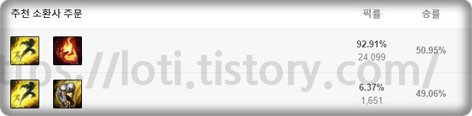 점화와 탈진을 사용을 합니다. 점화의 픽률과 승률이 높지만 탈진과의 승률 차이가 2% 안쪽으로 그리크지 않아서 상황에 따라서 탈진을 사용하셔도 나쁘지 않습니다.