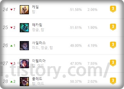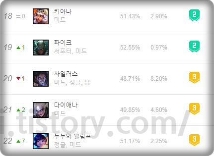 무려 미드, 정글, 탑 3라인을 가며 3라인 픽률이 모두 괜찮은 챔피언 입니다. 다만 승률이 전라인 50%를 넘지 못하기 때문에 솔랭픽이라고 말씀은 못 드린다는 점 알아두시면 좋을 것 같습니다. 거기에 정글의 경우 체력과 마나를 채울 수단이 부족하기 때문에 유지력이 상당히 떨어지고 정글링도 대미지 감소로 빠르지 않아서 승률이 매우 낮은 라인이고 개인적으로 사일 정글은 무리라는 점 기억해두시면 좋을 것 같습니다. 물론 성장 능력치와 계수 및 깡딜이 높아서 룬의 메아리까지 안정적으로 간다면 충분히 좋기는 합니다. 그게 어려워서 그렇지.