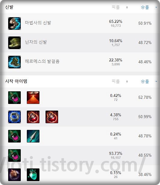 마법사의 신발이 신발중에서 픽률 승률 모든 면에서 좋습니다. 사일러스가 워낙 계수와 깡딜이 높기 때문에 생존력보다는 딜을 올리는 것이 효율이 좋습니다. 그리고 시작 아이템은 부패의 물약 시작이 무난하고 좋지만 도란링 시작이 승률이 좋습니다.