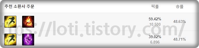 미드는 점화 텔, 정글은 강타, 탑은 텔 점화를 사용을 합니다. 미드는 점화텔의 승률과 픽률이 비슷하기 때문에 상대 챔피언을 보고 가주시면 되고, 탑의 경우에는 점화를 사용하기는 하지만 유리한 상성이 아닐때가 많아서 텔을 압도적으로 많이 사용을 합니다.