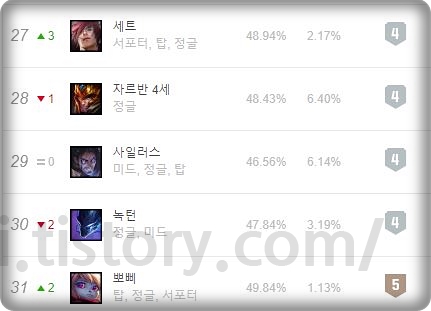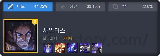 사일러스는 상체 라이너 치고 상당히 인기가 많은 챔피언입니다. 무려 상체 챔피언 중에서 에코, 리신을 제외한다면 18%가 넘는 유일한 챔피언이고 거기에 미드, 탑, 정글까지 가능하기 때문에 라인에 구애받지 않고 두루두루 사랑을 받는 챔피언입니다. 2020 시즌에도 패치를 통한 많은 변경이 있었고 결국 지금의 성능으로 정착이 되었지만 결코 처음 출시 때의 성능은 아니라는 것을 말씀드리고 싶습니다. 대회에서는 종종 나오며 엄청난 모습을 보여주지만 솔랭에서는 승률이 잘 안 나오는 챔피언으로 개인적으로 추천드리는 챔피언은 아닙니다.